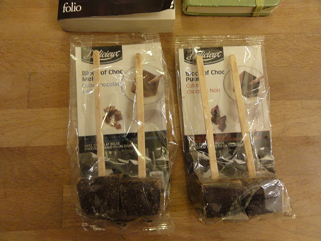 Toujours parce que j’aime l’écriture, Nelly avait donc ajouté un petit carnet vert à glisser dans le sac (le genre qui fait bien sérieux avec le petit élastique pour refermer) et, « en tant que belge » et pour que je puisse savourer un bon chocolat chaud en écrivant/lisant, des blocs de chocolat au bout d’un bâtonnet (je connaissais le concept, mais je trouve ça trop cool/rigolo/tentant).