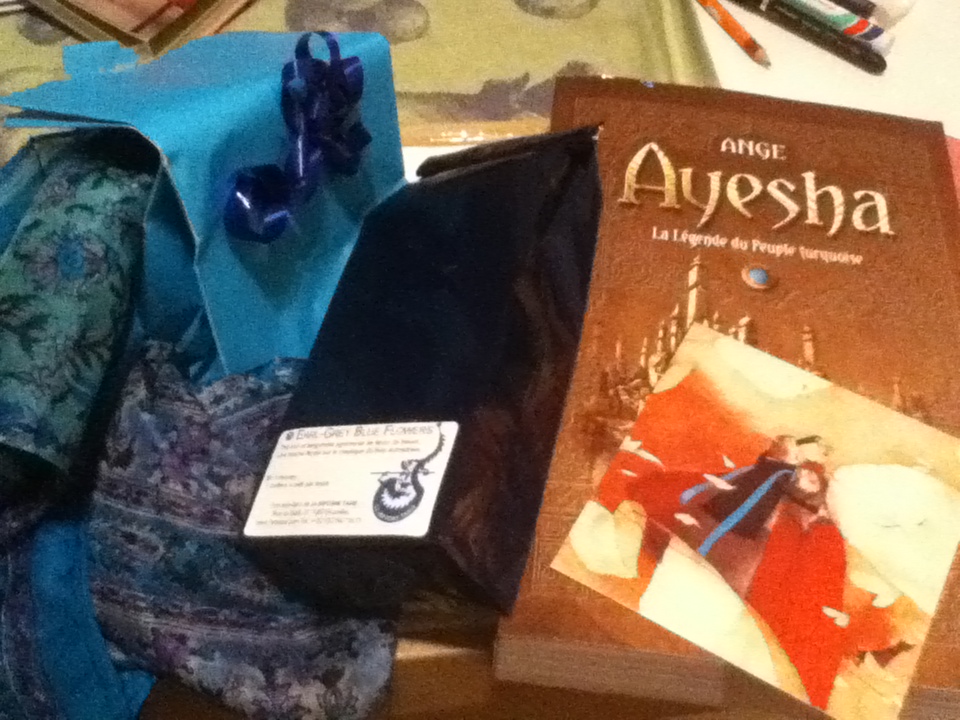 Le paquet était placé sous le signe de la couleur turquoise par rapport au titre du livre. J’ai donc découvert un petit sachet avec une belle écharpe en soie, ainsi qu’un sachet de thé. J’adore le thé et les écharpes ! C’est un swap qui a fait mouche à 100% ! Merci beaucoup pour ce très joli paquet ! Je me plonge dès que possible dans la lecture de cet ouvrage !