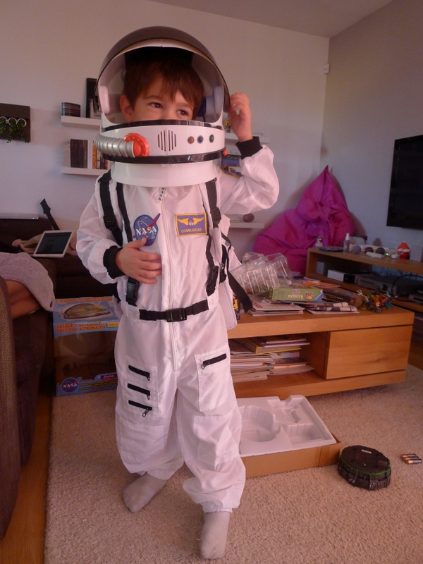 – Déballage des paquets entassés au pied du sapin par deux enfants surexcités. On note la présence d’un camion de police en Lego, du jeu Skyander pour la Wii et d’un superbe déguisement d’astronaute avec casque qui parle. Jalouse je suis; y’avait pas de jouets comme ça quand j’étais petite!