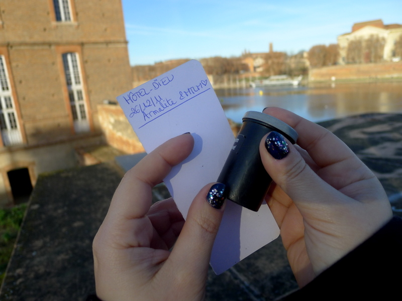 – Chercher 2 géocaches de l’autre côté du Pont Neuf. Pour une grande ville, Toulouse recèle étonnamment peu de caches, surtout dans le centre, et elles sont toutes assez éloignées les unes des autres. Le parcours « Bords de Garonne » que j’avais préparé nous aurait sans doute pris 2 heures et pas mal éloignés de la place Wilson où nous avions prévu d’aller au cinéma à 16h40. Nous nous sommes donc contentés de faire la « Hôtel Dieu » et la « Saint-Nicolas », 2 micros sans difficulté mais sans grand intérêt, avant de prendre le métro à Saint-Cyprien pour nous rapatrier du côté de Jean Jaurès.