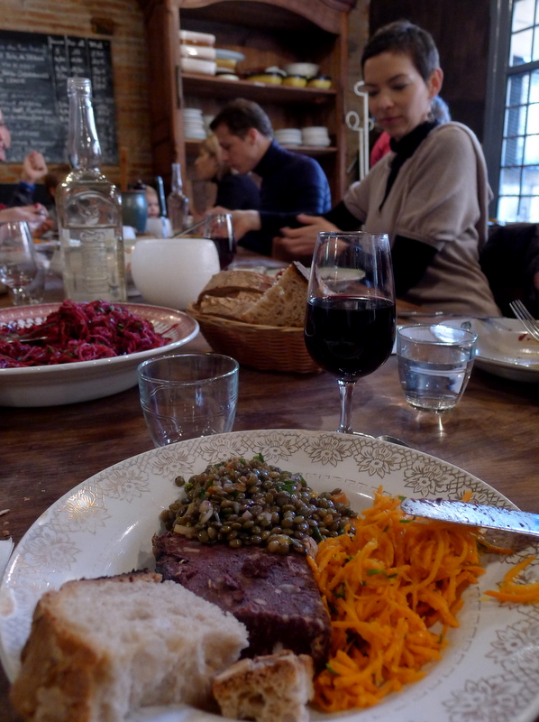 Dans une vieille maison toulousaine aux murs de brique nue et aux poutres apparentes, de grandes tables de fermes entourées de chaises dépareillées accueillent les convives. Un choix d’entrées est disposé au milieu: terrine de boudin, oeufs mollets, salade de lentilles, de carottes, de betteraves ou de chou râpé. Que du très rustique, certes, mais du rustique bien travaillé, sublime de goût et de fraîcheur. La huche à pain voisine avec la cheminée, et chacun va remplir lui-même sa corbeille, m’a expliqué un gentil tenancier à bouclettes brunes et petites lunettes.