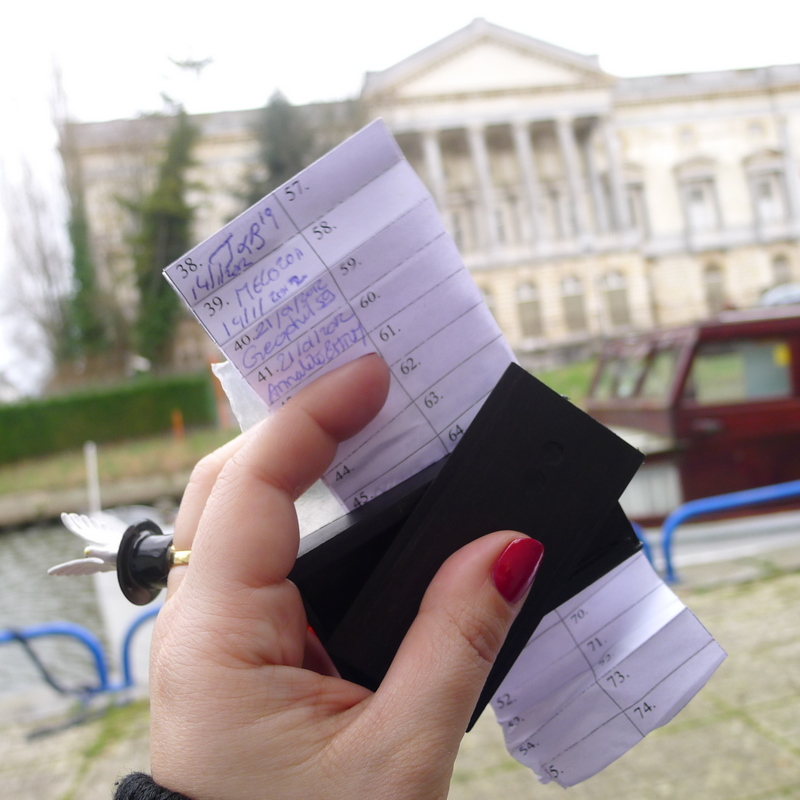 Après notre passage au musée du design, place au geocaching. En l’absence de caches traditionnelles dans le centre proprement dit, nous nous dirigeons vers la périphérie de Gand. Nous faisons coup sur coup la Park#2 et la Oud Justitiepaleis, qui se trouvent presque face à face de part et d’autre du canal. La première est une taille 2 planquée sous une grosse pierre et plus trop étanche; le logbook est trempé. Elle ne contient pas grand-chose, mais je procède quand même à un petit échange. La seconde utilise un conteneur plat et noir, si discret que nous mettons un long moment à le trouver dans les montants d’une série de sièges métalliques peints en bleu. Cette fois, c’est Philou qui finit par s’écrier: « J’ai! ». A trois, évidemment, on a plus de chances de réussir!