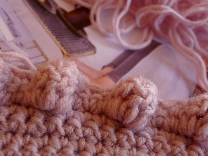 Trois mailles en l’air, cinq brides, et hop! une petite noisette. Sauf que du coup, au rang d’après, je me retrouve avec beaucoup plus de mailles que les 50 de ma chaînette initiale, donc pour compenser, je « saute » tous les dessus de brides pour continuer mes mailles serrées après. Résultat: des espèces de pompons qui font penser au point de noisettes tout court, mais pas du tout aux jolies ondulations très peu en relief de la photo dans mon livre. Damned.