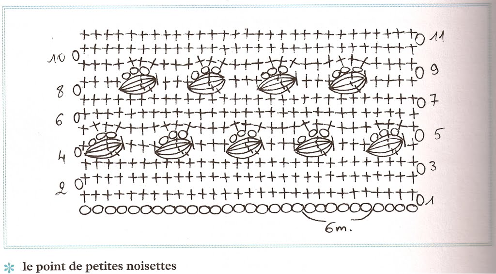 Du coup, je me penche d’un peu plus près sur les symboles. Le petit trait à la fin des cinq brides, ça voudrait pas dire un truc, des fois? Si: que les brides doivent être reliées ensemble, ce qui permet de n’avoir qu’une seule maille à reprendre au rang d’après. On progresse. Je défais et je recommence. Cette fois, je me retrouve quand même avec 58 mailles au lieu de 50 après le premier rang de petites noisettes… qui sont justement au nombre de 8. Mmmh. Et si j’essayais de supprimer une maille en l’air à chaque fois? Je re-défais et je re-recommence.