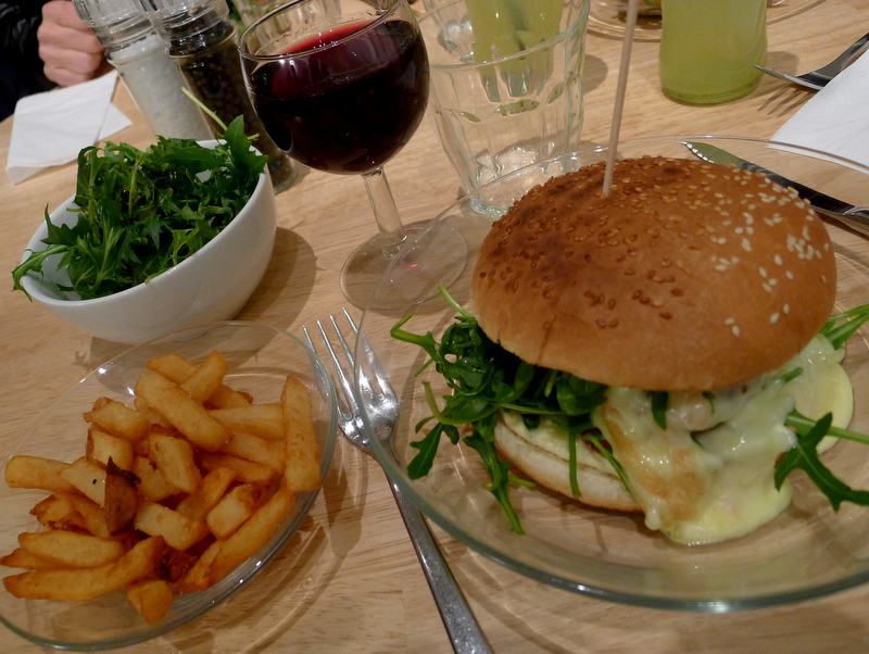 La portion de frites est plutôt chiche, mais vu la taille du burger, je ne suis pas sûre que j’aurais eu faim pour davantage. (Suite à ce billet, un message de la direction m’a gentiment informée que les frites sont à volonté, mais servies en petite portion pour ne pas qu’elles refroidissent trop vite. C’est bon à savoir.) Le pain au sésame est, disons, dans la moyenne supérieure de l’ensemble des buns que j’ai pu goûter: pas fracassant, mais pas mal quand même. Le steak est tendre et saignant comme je l’ai réclamé *insérer ici le titre d’une célèbre chanson de Leonard Cohen*, mais beaucoup plus petit que le pain, ce qui fait plein de bouchées « vides » sur le tour: pourquoi? La sauce est insuffisamment poivrée à mon goût, mais bien dosée, tout comme le fromage. Dans l’ensemble, un bon burger, pas hyper original mais d’un rapport qualité-prix plus qu’honnête à 12,40€. Pour aller avec, j’ai pris un verre de Bourgueil rouge sans histoire.