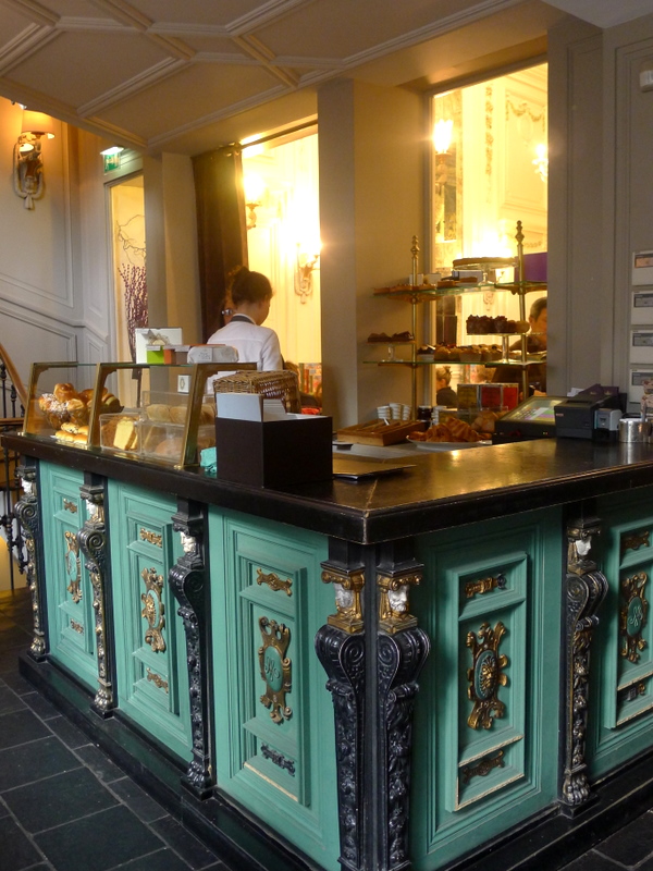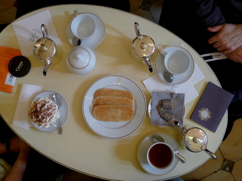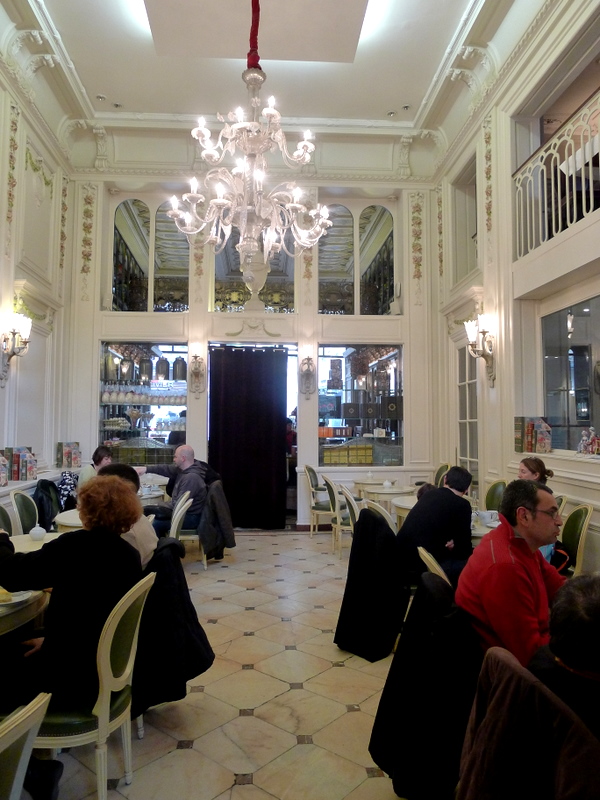 Je dois bien l’avouer, la façade de ton établissement est somptueuse, et le décor intérieur ne déçoit pas non plus. Nous avons été placés immédiatement par une serveuse souriante dans une salle calme et inondée de lumière. Après une longue consultation des cartes, nous avons commandé trois thés, un café viennois et trois gaufres (rassure-toi, mon ami Christophe ne te boudait pas, il suit juste un régime spécial en ce moment). Pour nous faire patienter en attendant l’arrivée de notre commande, on nous a offert de longs biscuits ovales genre gaufrette de supermarché format XL. Polie, je n’y ai pas touché.