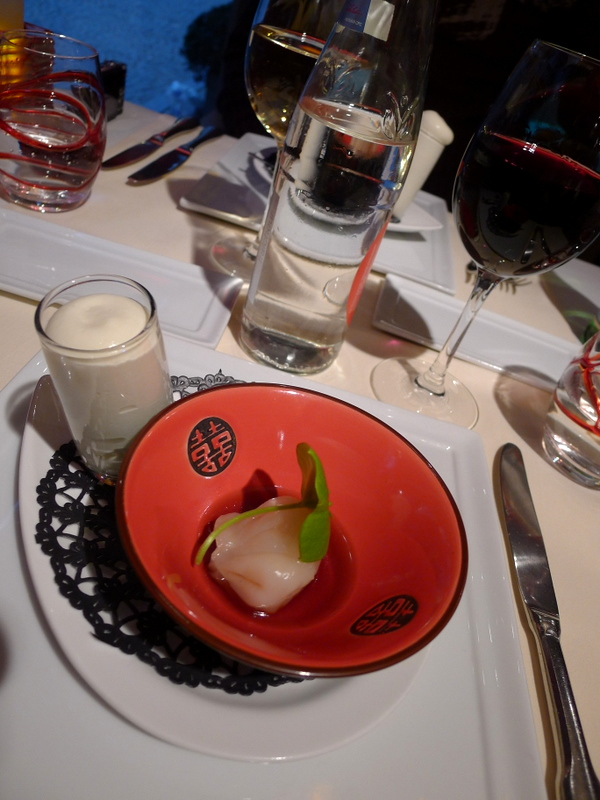 En amuse-bouche, nous avons droit à une petite mousse de céleri (qui me plaît beaucoup alors qu’en principe, je déteste ce légume) accompagnée d’un dim sum à la crevette. Nous attendons notre entrée ni trop, ni trop peu. Mon foie gras d’oie dans sa réduction de vin rouge à la truffe est une merveille; Chouchou semble également satisfait de la préparation de ses Saint-Jacques.