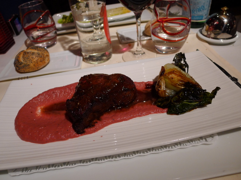 Dans l’intervalle entre entrée et plat, nous goûtons la petite motte de beurre breton avec des cristaux de sel dedans. Mmmh. Dommage que les petits pains aux graines de pavot soient un peu secs. Nos plats arrivent dans un délai là encore raisonnable. Le dressage n’a rien de recherché, mais j’ai droit à une belle pièce de veau que complètent parfaitement sa mousseline de betterave et son mini-chou chinois braisé. Le cabillaud de Chouchou, un peu plus classique, est lui aussi très bien accueilli.