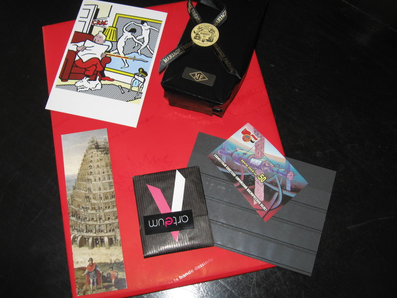 Dans son enveloppe, oh surprise je découvre une carte postale Tintin échappant de peu à une mort horrible par arme blanche alors qu’il lit tranquillement. Mais quel peut bien être le lien entre tout cela ?