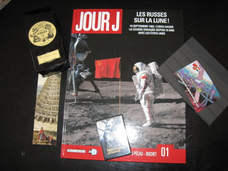 Dans un petit paquet cadeau se trouve un magnet kubrickissime ascendant geek de l’affiche de 2001 l’odyssée de l’espace. Bref, je n’y tiens plus j’arrache le papier rouge de cette BD Delcourt, premier tome d’une uchronie (que j’affectionne temps) JOUR J , les Russes sur la Lune : le 19 septembre 1969 l’URSS gagne la course engagée depuis 10 avec les USA ! Les tomes suivants m’intriguent, je pense qu’Eléonore a touché dans le mille et que je l’aime à ce jour d’amour vrai !