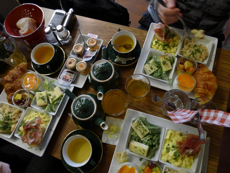 Mais même si le cadre était aussi joli que photogénique, la véritable question, c’était de savoir si le brunch serait à la hauteur. L’ardoise annonçait: « boisson chaude à volonté, jus de fruit (pomme), pain, beurre salé, confitures, Nutella, croissant, oeufs brouillés avec jambon cru ou saumon, risotto (crevettes-artichaut), fromages, fromage blanc avec coulis de fruits (abricot), salade de fruits », 22€. De prime abord, le prix me semblait un peu élevé. Puis j’ai vu arriver les assiettes.