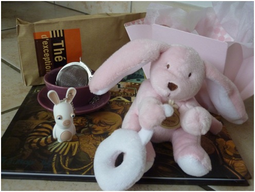 J’ai ensuite ouvert les deux derniers petits paquets, qui contenaient chacun un petit lapin, un joli lapin doudou rose, avec de grandes oreilles, qui trône depuis sur mon chevet, et un lapin crétin clef USB (j’avais dit que j’adorais les lapins crétins??), que je vais remplir de musiques diverses et variées et qui deviendra incessamment sous peu le meilleur compagnon de mes trajets en voiture.