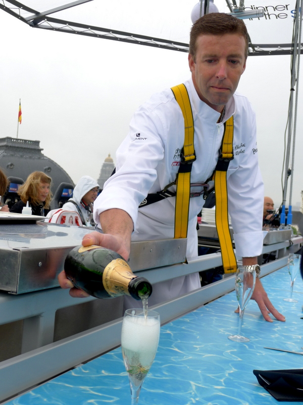 Etant donné que je suis à la fois fan d’activités aériennes et de très bonne bouffe, vous imaginez à quel point j’étais excitée de compter au nombre des 22 chanceux qui ont participé à la première levée de la plateforme pour cette édition 2012. Après une courte conférence de presse durant laquelle les flashes ont crépité, nous avons pris place autour de la table; les techniciens qui avaient procédé aux dernières vérifications techniques nous ont harnachés, et la plateforme a quitté la terre ferme tout en douceur.