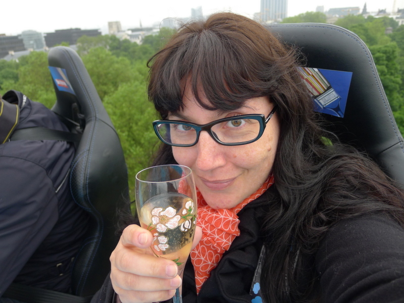 Il pleuvait et il y avait un peu de vent. Tous les invités avaient gardé leur manteau, et malgré les lampes chauffantes au-dessus de nous, je n’ai pas regretté d’avoir pris une écharpe. Face à moi, deux jeunes femmes visiblement sujettes au vertige semblaient faire de gros efforts pour ne pas regarder vers le bas. Pour ma part, j’avais un sourire d’une oreille à l’autre et je mitraillais tout ce que je pouvais avec mon Lumix. Comme mon voisin journaliste, j’ai utilisé la célèbre technique de l’appareil tendu à bout de bras pour m’auto-tirer le portrait avec ma coupe de champ’.
