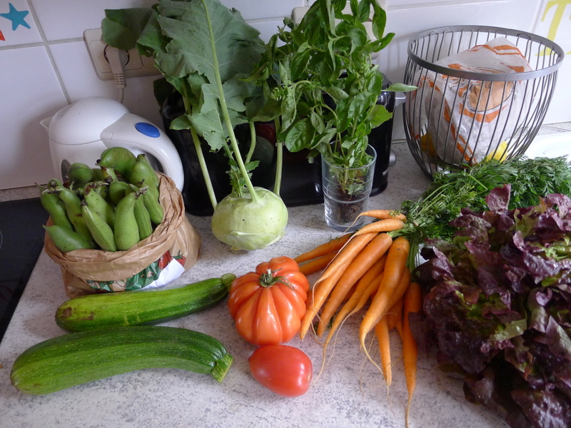 C’est vrai qu’il y a quelques contraintes. La commande doit être passée le lundi avant 11h; le paiement se fait uniquement par virement bancaire; la composition du panier est connue à l’avance mais ne peut être modifiée. D’un autre côté, ça oblige à préparer et à consommer des légumes qu’on n’a pas l’habitude d’acheter. Par exemple, la première semaine, j’ai eu des épinards frais en branches (je les prends toujours surgelés et déjà hachés); et la seconde, un chou-rave avec lequel j’ai fait un pseudo-gratin dauphinois. Les légumes étaient tous délicieux; le crottin au poivre et le bagel au sésame testés par ailleurs ne déméritaient pas non plus. Et j’apprécie beaucoup la petite notice avec les nouvelles du potager et quelques suggestions de recettes qui accompagne chaque commande. Par exemple, que faire avec le kilo de fèves des marais ci-dessus? Des fèves à la paysanne, pardi!