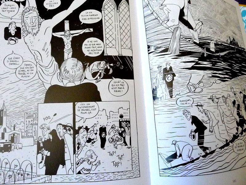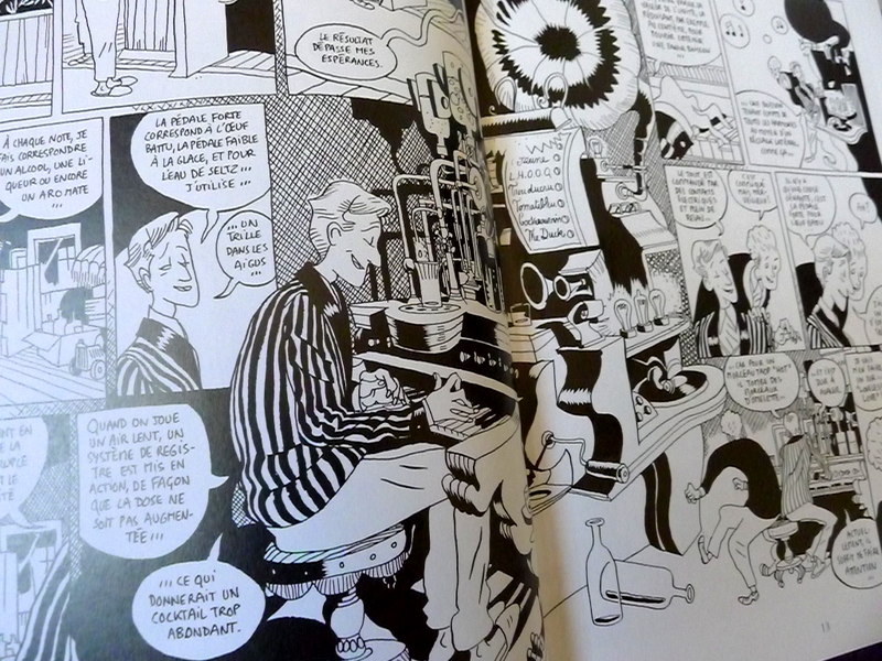 Du scénario, je ne dirai pas grand-chose, sinon que c’est une fidèle adaptation du roman de Boris Vian: un mêli-mêlo de thèmes sociaux abordés avec plus ou moins de profondeur et de distance, et servant de toile de fond à une histoire d’amour qui finit trèèès mal. L’intérêt de cette bédé, bien sûr, c’est son graphisme faussement naïf, fantaisiste, foisonnant et peu avare en fâmâpoâls, qui malgré son absence de couleurs colle parfaitement à l’atmosphère surréaliste créée par Boris Vian. Et parce qu’une image vaut mieux que mille mots, en voici trois: