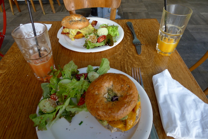 Nous avons commandé un bagel oeufs brouillés-bacon-cheddar pour Chouchou, et un poulet-guacamole-cheddar pour moi. Ils ont mis vraiment très longtemps à parvenir à notre table, peut-être parce que nous étions les premiers clients de la journée. J’ai trouvé le mien très satisfaisant, bien meilleur que celui que j’avais mangé la semaine précédente chez les Fils à Maman (bien que pas encore tout à fait au niveau de ceux du Pays des Merveilles). Même la salade, d’ordinaire là juste pour l’alibi légume et la tache de couleur, était bonne et bien assaisonnée, avec des petites graines de sésame sur le dessus. Chouchou, par contre, n’a pas eu l’air très content de son choix – et Dieu sait qu’il est moins difficile que moi en matière de nourriture.