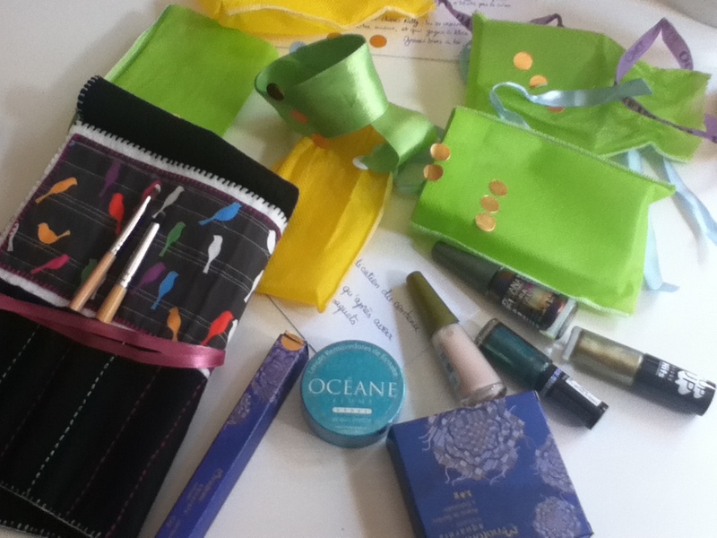 Il y a aussi deux produits d’une marque brésilienne, un crayon et une palette que je n’ai pas encore eu l’occasion de tester. Ensuite une petite boite de cotons déjà imbibés de dissolvant et enfin, pas des moindres, une pochette à pinceaux fait des propres mains de ma swappeuse avec deux pinceaux déjà bien rangés à leur place !
