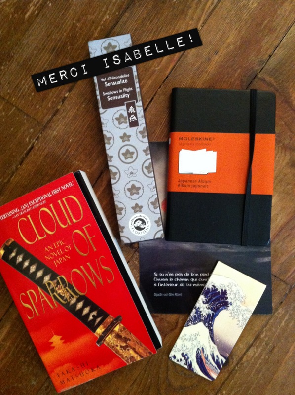 Merci également pour tout ces jolis cadeaux : un ingénieux marque page aimanté pour qu’il ne dépasse pas de la page, et donc ne s’abîme pas. Un très chouette carnet Japonais de Moleskine, très beau. J’adore Moleskine, mon agenda en est un. Là encore, tu as visé dans le mille ! Enfin, merci également pour ces bâtons d’encens qui embaumé tout le colis. Un bonheur de l’ouvrir. Il embaume maintenant ma maison.