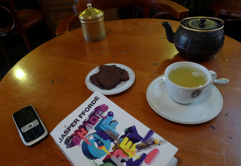 A 14h25, je suis au Comptoir Florian. Après avoir failli réclamer un Kabuze Kukicha dont j’adore la subtilité, je décide plutôt de tester quelque chose de nouveau et commande un Versailles (thé vert à la nectarine et au citron). Je le sirote en lisant trois ou quatre chapitres de « Shades of Grey » de Jasper Fforde. Je viens de dépasser le premier tiers, mais j’ai beaucoup de mal à accrocher sur ce bouquin – et de plus en plus mal au ventre. Au bout d’une demi-heure, je capitule et je m’en vais. Dehors, il s’est mis à pleuvoir… Pas un déluge, juste de quoi faire chier la promeneuse en goguette.