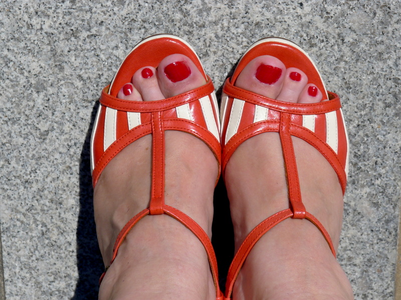 Et ça, ce sont mes dernières Chie Mihara en date, trouvées soldées à – 50% chez Les Anonymes. Ce ne sont pas du tout les chaussures qui m’avaient tapé dans l’oeil au premier regard; pourtant elles sont parfaites, à la fois originales et pas très difficiles à assortir. Je n’ai qu’un regret: que leur rouge ne soit pas un peu plus vif (on dirait plutôt du orange foncé, en fait).