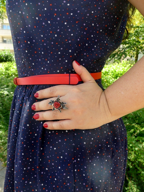 Très joli look 🙂 J'aime beaucoup la robe et son imprimé étoilé, et je craque complètement sur ta bague ! Quant aux Chie Mihara… non, en fait, je ne vais même pas en parler, juste mettre des sous de côté. (J'ai déjà explosé mon budget chaussures de l'année.)
