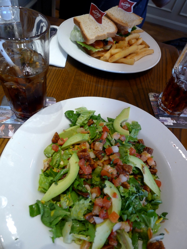 Premier couac: nous sommes servis par une jeune femme espagnole certes charmante, mais qui ne parle pas un mot de français (ni de flamand, je présume). Nous pouvons nous exprimer en anglais, mais est-ce nécessairement le cas de tous les Bruxellois? La carte qu’elle nous présente est sans surprise; on y trouve à peu près la même chose que dans tous les HRC du monde. Comme nous avons envie de manger léger, nous ne demandons pas ce que contient le burger « local ». En l’absence de ma bien-aimé Cobb salad, je commande une salade au poulet fumé, et Chouchou un Californian club sandwich.