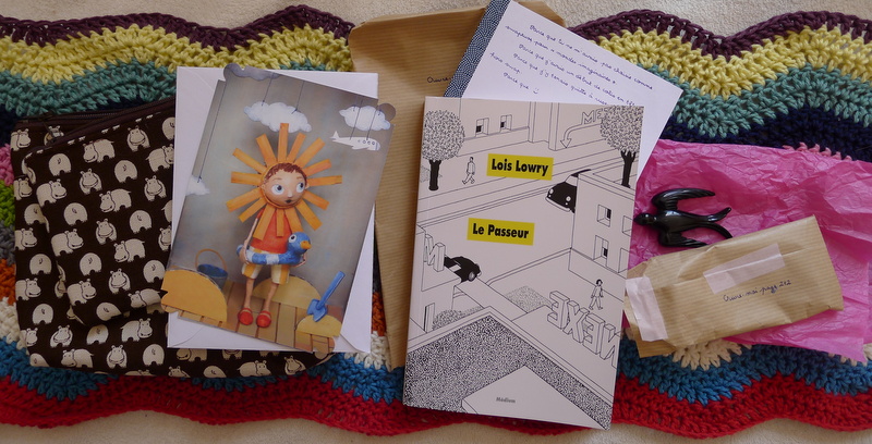 Il y a quelques semaines, j’ai reçu un paquet envoyé par Mélusine. Il contenait un roman de Lois Lowry, « Le Passeur », ainsi que deux objets et une carte enveloppés dans du papier kraft avec la mention: « Ouvre-moi page XX », plus un petit mot m’expliquant que même si je ne l’avais pas choisie comme swapeuse durant le swap des mondes imaginaires, Mélusine avait une idée de colis pour moi, et donc voilà.
