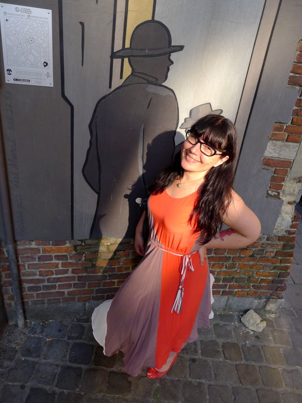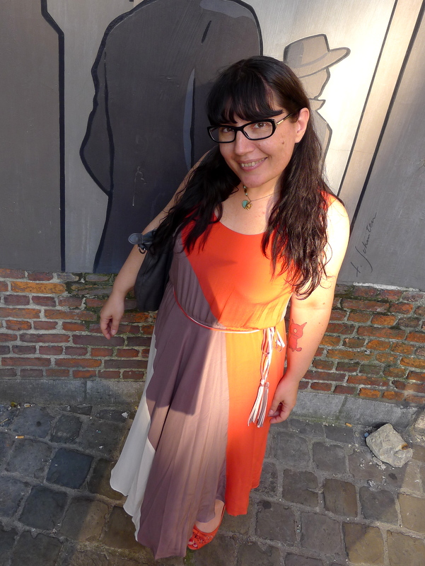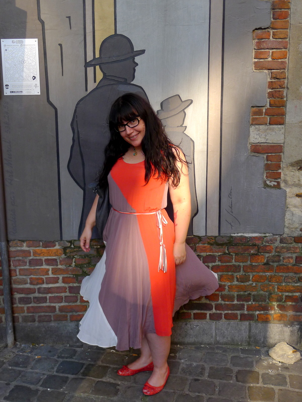 Voici donc la fameuse robe en soie Caroll achetée pendant les soldes. Elle se froisse vite, et la coupe droite du haut donne l’impression que j’ai un buste carré et pas vraiment de taille. Mais j’aime ses couleurs, et je la trouve très agréable à porter. Au moindre souffle de vent, la jupe danse joliment autour de mes jambes sans jamais se soulever de manière embarrassante.