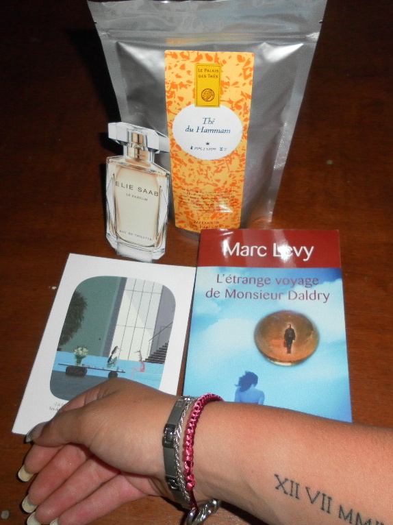 & la suite n’est que bonheur: dans le petit paquet violet un petit bracelet » Made in Camille » qui a tout de suite adopté mon poignet, ensuite un grand sachet de thé qui respire les senteurs orientales et plus particulièrement celle de Turquie, ce dernier se boit chaud comme froid ce qui est idéal étant donné les chaleurs caniculaires du moment. Concernant le livre ma swappée est tombée juste en m’offrant un livre de Marc Levy (dont je suis fan depuis toujours!) » L’étrange voyage de Monsieur Daldry » ; je l’ai lu à sa sortie mais c’est avec plaisir que je vais me replonger dans l’univers d’ Istanbul (nb: Une jeune créatrice de parfum va de ville en ville,de pays en pays pour découvrir que…) accompagné d’un marque-page en forme de bouteille de parfum .
