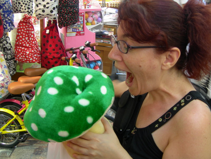 – Le shopping kawaii dans les artères couvertes parallèles de Kyoto, dont j’oublie tout le temps le nom à rallonge (septembre 2007). Chouchou et moi étions comme deux gosses devant les milliards de breloques de téléphone Godzilla ou Super Mario, les sushis et les donuts en peluche, les mini-poupées Blythe et les figurines d’héroïnes de manga mammairement avantagées, les pâtisseries aux improbables couleurs fluo et les temples bouddhistes planqués entre les échoppes.