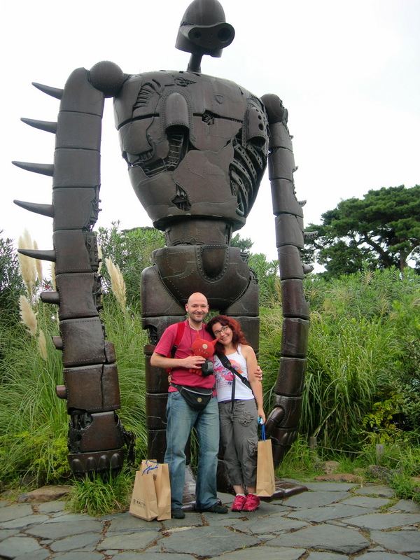 – Ma première visite au musée du studio Ghibli, simplement magique (septembre 2007). Tout m’a enchantée, depuis le dessin animé diffusé en exclusivité dans une petite salle de cinéma jusqu’à l’adorable restaurant dont le strawberry shortcake tabassait tout en passant par la reconstitution d’atelier où l’on peut consulter les storyboards maison, le robot grandeur nature sur le toit et même le billet d’entrée fait d’un morceau de pellicule originale. Jamais je n’oublierai la mine dépitée de Chouchou quand il a vu que l’accès au chat-bus était réservé aux enfants de moins de 10 ans.