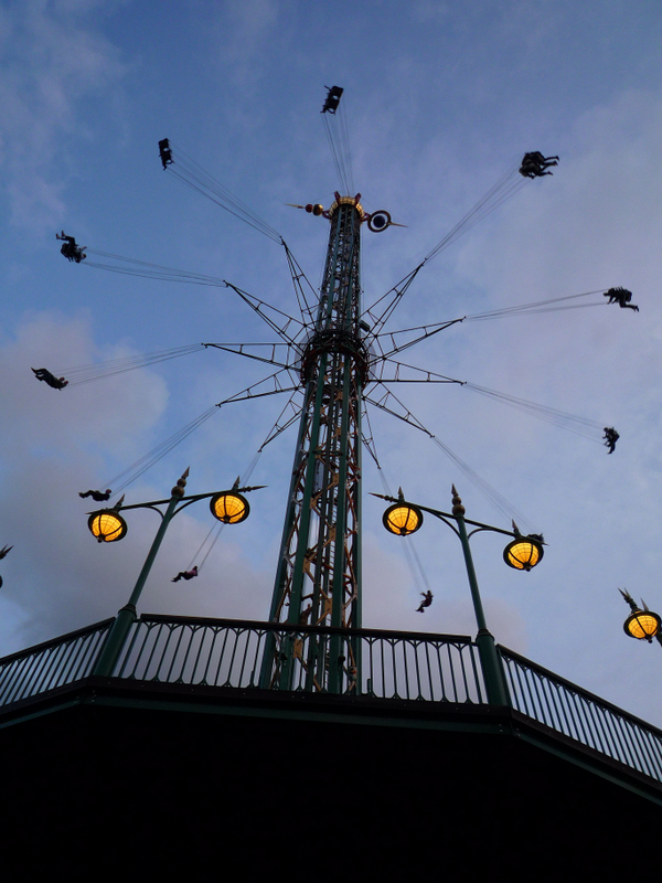 – Le tour de chaises volantes au Tivoli, parc d’attractions délicieusement vieillot, tandis que la nuit tombait sur Copenhague (septembre 2008). Le ciel était indigo et l’air froid nous mordait le visage; nous planions au-dessus du joyeux brouhaha de la fête avec, au-delà du mur d’enceinte, une vue imprenable sur les lumières de la ville.