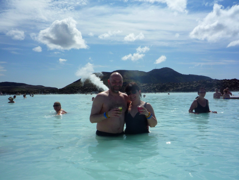 – La baignade dans les bassins chauds du Blue Lagoon, avec du vin pétillant à la fraise et un masque de boue blanche (juin 2012).
