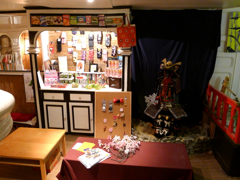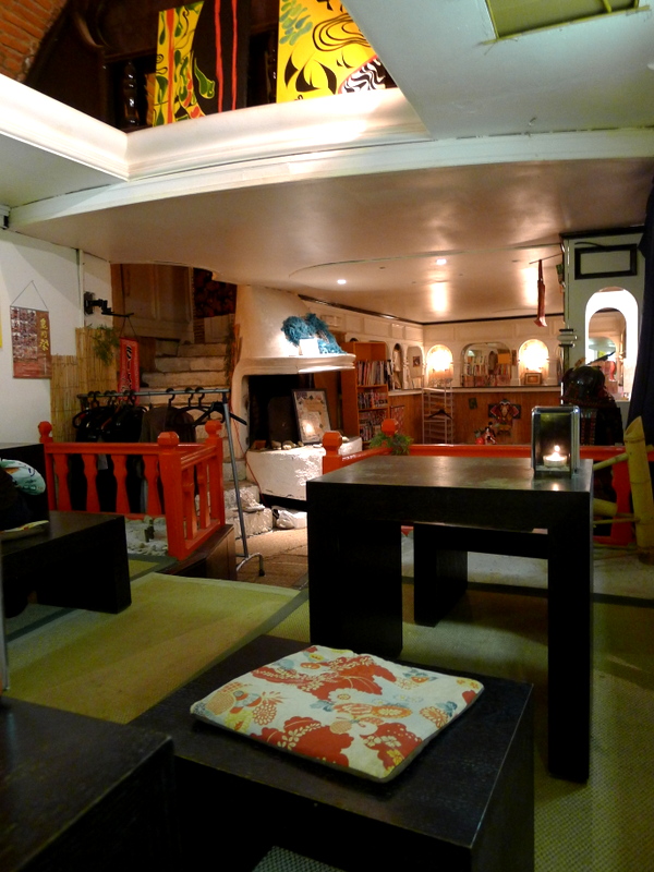 Tout au bout du couloir du rez-de-chaussée, nous avons franchi un noren et descendu un long escalier aux marches de pierre inégales qui s’enfonçait dans les entrailles du bâtiment. Nous avons débouché dans une cave sombre et humide, basse de plafond, à l’entrée de laquelle nous avons dû nous déchausser. Sur la droite, dans la partie légèrement surélevée, se trouvaient plusieurs petites tables noires avec des sièges assortis et un bar dans le fond. En face, des kawaïeries sur une sorte d’autel voisinaient avec une armure de samouraï. Sur la gauche, une grande table basse entourée de coussins pouvait accueillir tout un groupe de clients au milieu d’une profusion de mangas en VO. A part nous, il n’y avait que deux jeunes femmes en train de boire un thé.