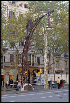 La première des deux était censée se trouver dans le voisinage de la Casa Battlò. L’indice (« Pere Falques », autre architecte moderniste espagnol) et les coordonnées GPS nous ont conduits vers l’un des bancs-lampadaires qui bordent le Passeig de Gracìa. C’était en plein jour, et il y avait des touristes un peu partout. Difficile de chercher sans se faire remarquer. Nous avons profité que l’un des sièges placés dos à dos était libre pour tâtonner plus ou moins discrètement sur les montants métalliques. Rien de notre côté, et l’autre siège était occupé par un couple de Français qui ne semblaient pas pressés de partir. Pour tuer le temps, nous avons feuilleté l’un des jolis carnets de voyage sur Barcelone achetés un peu plus tôt chez Doctor Paper. J’étais à peu près certaine que la cache se trouvait à l’intérieur d’une volute située côté chaussée… Dix minutes plus tard, le couple s’est levé et éloigné, et j’ai pu vérifier que mon intuition était juste. La boîte n’était pas immense; en insistant un peu, j’ai quand même réussi à y caser, en plus du logbook rempli, le Travel Bug Millenium Falcon que je traînais depuis notre voyage à Reykjavik, en juin, faute d’avoir trouvé entre temps une cache assez grande pour l’y déposer. Youpi! Nous nous sommes engouffrés dans la station de métro voisine en nous congratulant pour ce boulot rondement mené.