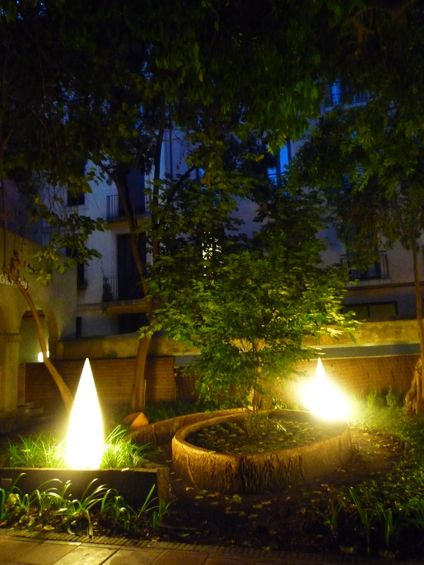 Plus tard le même jour. En nous dirigeant vers le resto bio situé dans le quartier du Born où nous avons l’intention de dîner, nous tentons cette cache à deux accès. Le premier, un ascenseur situé dans une ruelle déserte, est en panne. Le second implique de traverser le hall d’un hôtel plutôt chic. Nous prenons notre courage à deux mains, notre GPS dans l’autre, et nous nous approchons de la réception. « Pudiera ascender al jardì de la casa Ignacio de Puig? ». Entre mon accent atroce et ma grammaire approximative, l’employé masque mal son hilarité, mais il me désigne un escalier situé au fond du hall. Nous montons et débouchons dans un endroit étonnant: un jardin romantique suspendu, à l’éclairage assez particulier. Très joli, désert et extrêmement calme, alors que nous nous trouvons en plein coeur d’un quartier fort animé. Si mon estomac ne criait pas famine et s’il faisait deux ou trois degrés de plus, je me poserais volontiers dans l’une des chaises longues pour boire un cocktail et échanger quelques bisous avec Chouchou voire plus si affinités. En l’état des choses, nous nous contentons de trouver la cache assez rapidement malgré un indice sibyllin au premier abord.