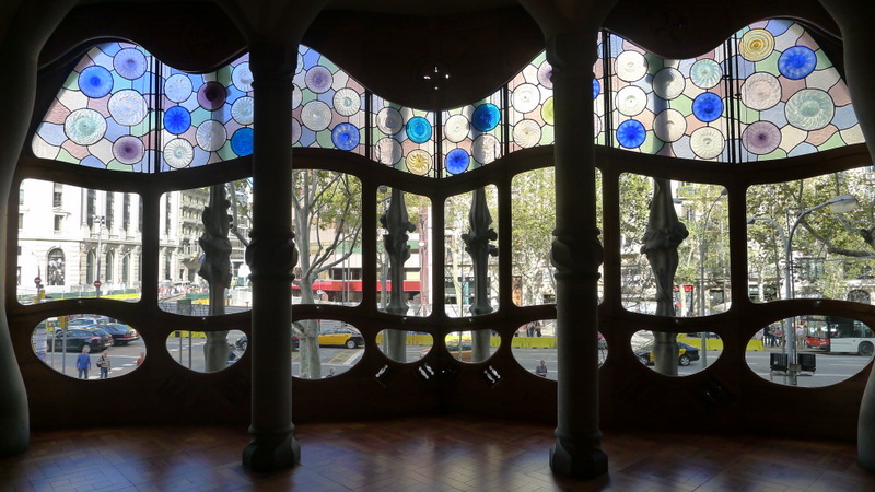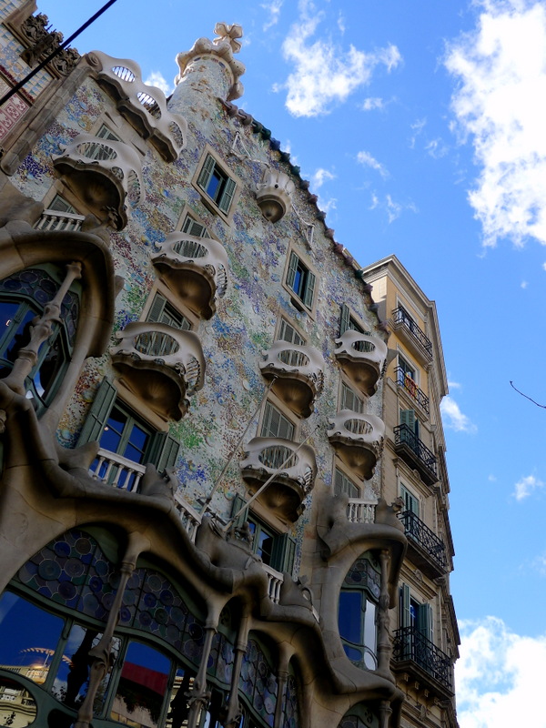 Qui dit Barcelone dit Gaudi, génial architecte dont toute l’oeuvre « organique » s’inspire directement des formes et des structures présentes dans la nature. Qui dit Gaudi dit la Sagrada Familia, cathédrale monumentale toujours pas achevée à ce jour mais consacrée récemment, devant laquelle des centaines de personnes font la file dès l’ouverture, et le parc Guëll avec son immense banc en accordéon et sa salamandre en mosaïque sur laquelle les touristes se vautrent littéralement pour une photo souvenir parasitée par des milliers de leurs semblables. Nous avons visité ces deux sites incontournables et admiré leur beauté. Mais mon véritable coup de coeur a été pour une troisième réalisation de Gaudi: la Casa Battlò, située dans le Passeig de Gracià, en plein milieu du quartier chic de la ville.