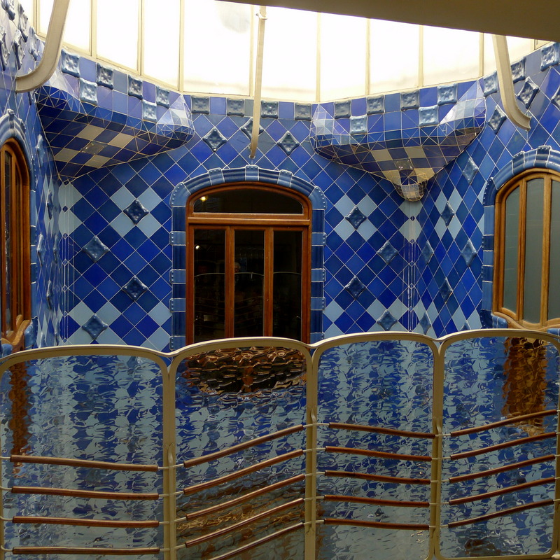 J’avais à peine mis les pieds à l’intérieur que je voulais chasser tous les autres visiteurs en hurlant: « C’est chez moi, chez moi, chez moi! ». La Casa Battlò, c’est un peu ma maison de rêve avec son absence d’angles droits, ses courbes fluides, ses deux puits de lumière, la fantastique baie vitrée de son grand salon, sa marqueterie somptueuse, ses mosaïques fantasques, ses combles inspirés de l’intérieur d’une baleine et son toit-terrasse aux tuiles en forme d’écailles. Et même si je suis favorable à la culture pour tous et à la préservation des patrimoines nationaux, je me suis sentie très triste à la pensée qu’elle était devenue un musée et ne remplissait plus son dessein initial: servir de foyer à une famille, voir grandir ses membres, être le théâtre et le témoin de leur vie intime, respirer leurs rêves, bercer leurs joies et leurs drames. Au-delà de la prouesse architecturale, c’est vraiment un lieu qui a une âme. J’espère au moins que les flots de touristes qui y défilent chaque jour ne sont pas trop accaparés par leur maudit audioguide pour s’en rendre compte.