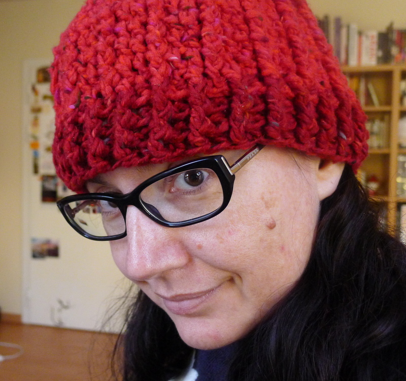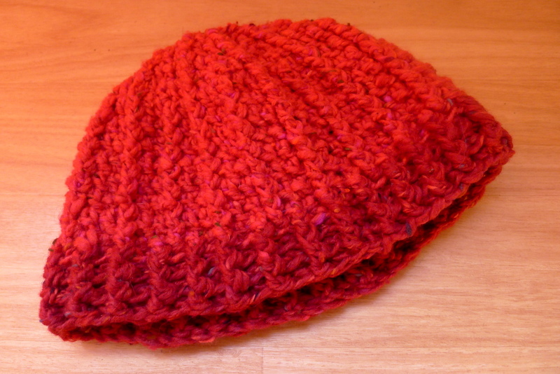 commande sur un site anglais; comme ce fil était en promo et qu’il fallait amortir les frais de port forfaitaires, j’ai pris un écheveau de rouge (choisi sur nuancier, car je n’avais pas la référence) et un d’aubergine, en me disant que je pourrais en faire un autre bonnet. (Un autre bonnet moins les deux derniers rangs, donc, si vous avez suivi. Hum. Bref.) Quand la laine est arrivée, bien entendu, le rouge n’était pas le bon, plus foncé que celui que j’avais utilisé au début. Mais j’ai pensé que ça pouvait quand même donner pas trop mal si je défaisais le premier rang de côtes pour refaire les 3 de la même couleur.