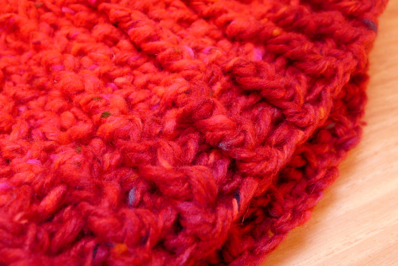 J’ai cherché dans mon panier à laine un autre fil assez épais pour être crocheté avec du 7 (au lieu du 5.5 préconisé, parce que je travaille vraiment serré), et opté pour un écheveau de Donegal Luxury Tweed Chunky rouge moyen de chez Debbie Bliss. J’ai passé une bonne heure à transformer ledit écheveau en pelote, en emmêlant tout au passage et en jurant comme le capitaine Haddock un jour de grande forme.