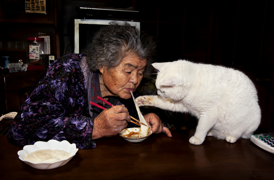 Il y a 12 ans, la photographe japonaise Miyoko Ihara, désireuse de conserver une trace de la vie de sa grand-mère, a commencé à la prendre en photo dans sa petite maison à la campagne ou au travail dans les champs alentour. Et puis un jour, mémé Misao a trouvé dans sa cabane à outils un chaton aux yeux étranges – l’un jaune et l’autre bleu. Elle l’a appelé Fukumaru, dans l’espoir que le dieu de la chance (fuku) viendrait à travers lui aplanir toutes les difficultés pour rendre sa route fluide comme le tracé d’un cercle (maru).