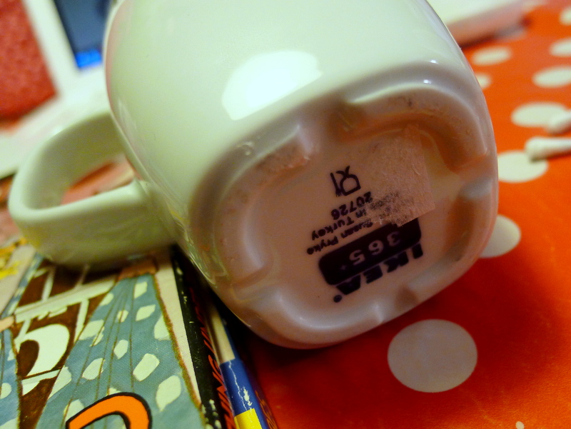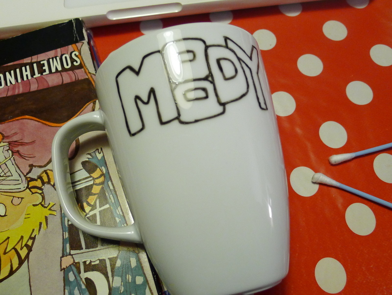 Là, j’ai beaucoup galéré, d’abord pour trouver les personnages sur papier en tentant de reproduire le style qu’utilise Chouchou pour ses bédés, puis pour les reproduire correctement sur une surface pas franchement plane à main levée. J’avais fait exprès de choisir des mugs légèrement « facettés » dans la partie basse, et calé la poignée avec des bédés pour pouvoir travailler sans qu’ils bougent trop. Quand même, ça n’a pas été une partie de plaisir. L’encre doit partir facilement avec de l’alcool à 90° tant qu’elle n’est pas sèche, hélas! Chouchou venait juste de jeter notre flacon périmé pour le remplacer par… de l’isobétadine. J’ai donc dû me contenter d’un chiffon trempé dans de l’eau pour corriger mes ratés, ce qui était beaucoup moins efficace.
