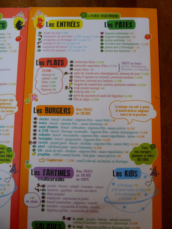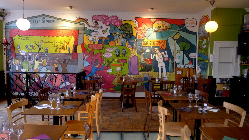 La déco de style récup’ bon enfant est dominée ici par une grande fresque dédiée à la belgitude dans toutes ses incarnations. Chouchou m’en a décortiqué tous les détails afin de parfaire ma culture. Il est vrai qu’en tant que Française, je n’avais jamais entendu parler de Sandra Kim et de la chanson qui lui a permis de remporter l’Eurovision en 1986, ni de la marionnette cracheuse Malvira, et encore moins de l’enlèvement au cours duquel le politicien Paul Vanden Boeynants se vit confisquer son pantalon.
