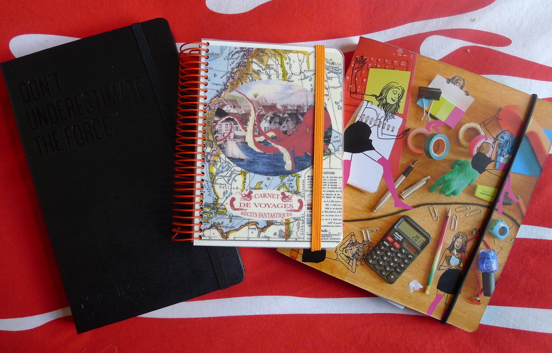 Le Moleskine Star Wars grand format/une page par jour comme agenda des choses faites, un carnet de La Mucca à mettre dans mon sac pour la prise de notes itinérantes, et le Margaux Motin 2013 (vraiment ravissant à l’intérieur) comme agenda des choses à faire.