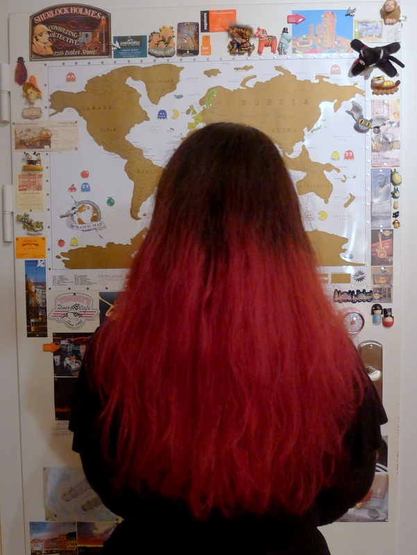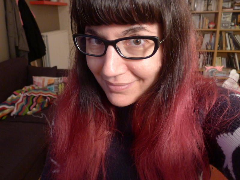 La colo rose commence plus haut que je ne le voulais, et la transition n’est pas aussi subtile que je l’espérais. Ce n’est pas très grave, car la couleur ressort vraiment bien, et du coup, la décolo durera plus longtemps au fur et à mesure que mes cheveux pousseront et que j’en couperai les pointes. Mes longueurs sont très peu abîmées; au toucher, je ne sens pour ainsi dire aucune différence avec mes racines. Pour que le rose ne s’estompe pas trop vite, je dois faire le moins de shampoings possible. Jusqu’ici, je me lavais les cheveux tous les 2 ou 3 jours; je vais tenter d’augmenter cet intervalle d’une journée en recourant à du shampoing sec sur les racines entre deux. Fred m’a prévenue que la couleur se fixerait mieux la deuxième fois, et encore mieux la troisième. A la base, je ne pensais pas garder ça très longtemps, mais je suis tellement contente du résultat et tellement emballée par l’accueil reçu chez Wakko que j’envisage maintenant de renouveler la couleur jusqu’à élimination de la décolo, ce qui devrait prendre un certain temps vu que je coupe seulement 5 cm de pointes tous les 6 mois. Quand j’en aurai marre du rose, j’essaierai sans doute le violet, qui devrait facilement pouvoir s’appliquer par-dessus un rose délavé sans nouvelle décolo.