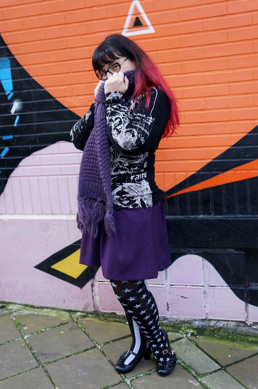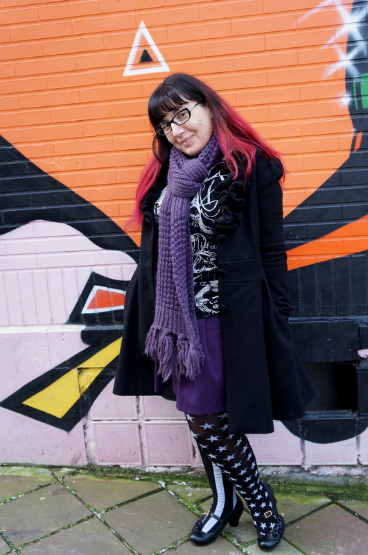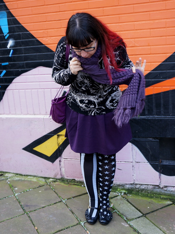 La tenue est très bien coordonnée, comme toujours. Je trouve que les couleurs se répondent bien, et en effet, le combo noir/blanc/rose/violet/motifs donne un petit côté punk ! 🙂