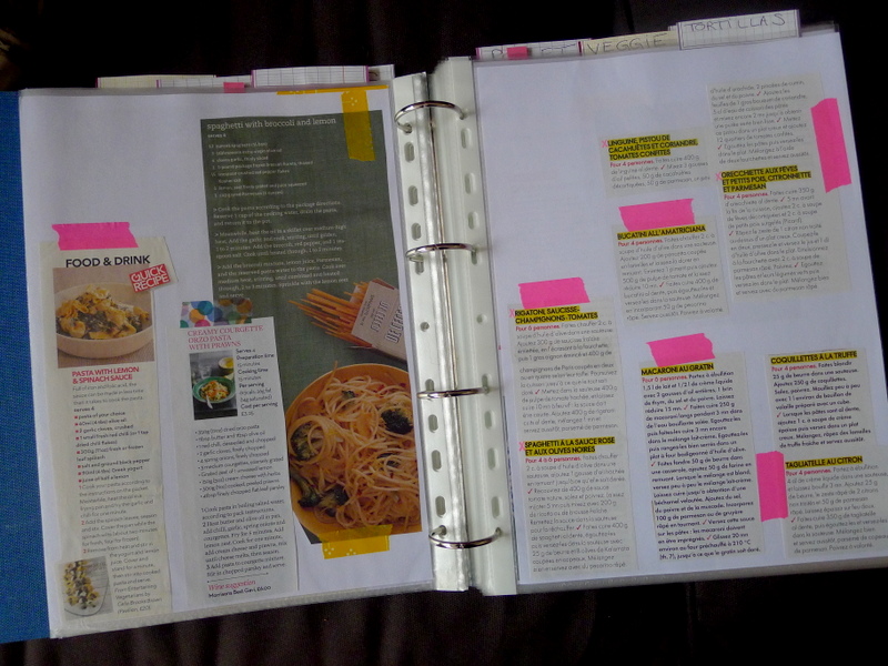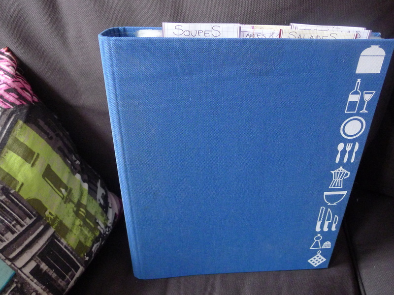 J’aime bien récupérer des recettes à droite à gauche – les découper dans des magazines féminins, demander à des amies de me donner celles que j’ai testées et appréciées chez elles… Il y a quelques années, j’avais conçu le projet ambitieux d’en faire un grand cahier illustré par des dessins, voire de remplir une boîte à fiches comme font les Américaines, avec des couleurs différentes selon la catégorie des plats. J’ai fait plusieurs tentatives, mais c’était trop de boulot, et j’abandonnais chaque fois en cours de route. Mes recettes restaient sans domicile fixe, et je me retrouvais en outre avec des tas de carnets à peine entamés ou de matériel non utilisé qui me donnait des remords depuis l’étagère où je l’avais parqué. Ca n’allait pas du tout. Jusqu’au jour où j’ai décidé que le mieux était l’ennemi du bien et qu’à défaut d’avoir un beau cahier marthastewardesque, je pouvais bricoler un système de rangement rapide, facile et pratique en m’inspirant de mes anciens classeurs d’étudiante.