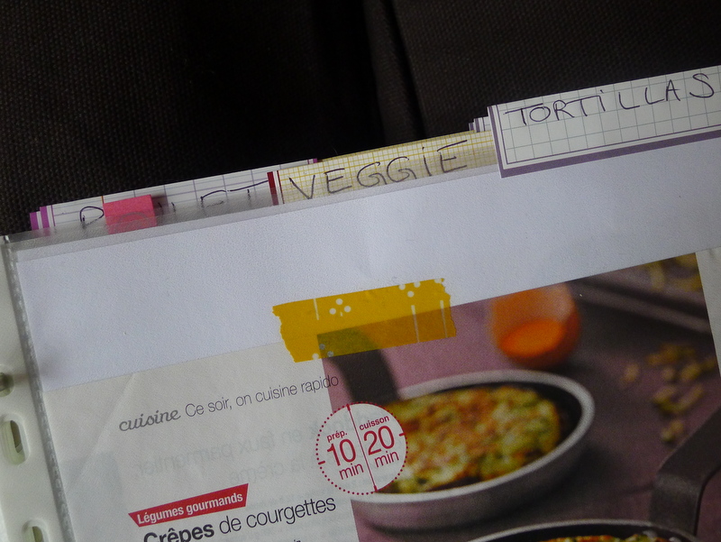 Pour chaque catégorie (« soupes », « salades », « pâtes et riz », « végétarien »…), sur le dessus de la face avant de la première pochette, j’ai plié une étiquette en deux de façon à ce que 2mm environ pince le plastique, et que le reste dépasse pour être bien visible. D’une catégorie à l’autre, j’ai décalé les étiquettes afin d’en voir un maximum à la fois.