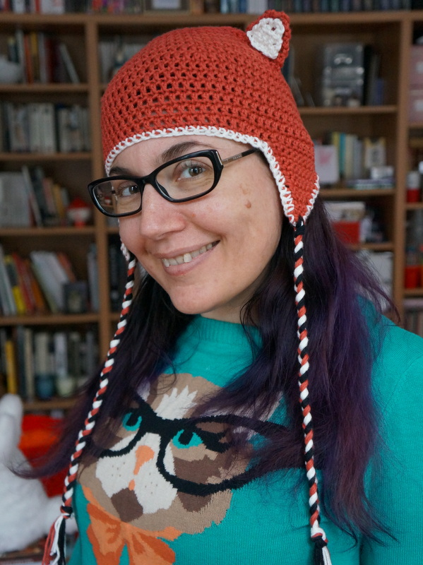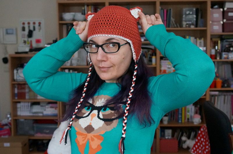 En ce moment, je fais une fixation sur les renards. Et je cherchais un projet rapide pour utiliser une partie des restes de laine de ma couverture rayée. Donc, je me suis dit que j’allais confectionner un bonnet avec des oreilles de renard. J’ai cherché sur Ravelry un patron que je pourrais adapter facilement, corrigé et modifié 2-3 petites choses (notamment la forme des oreilles), et deux séances de 2h de crochet plus tard, ta-daaaaam!